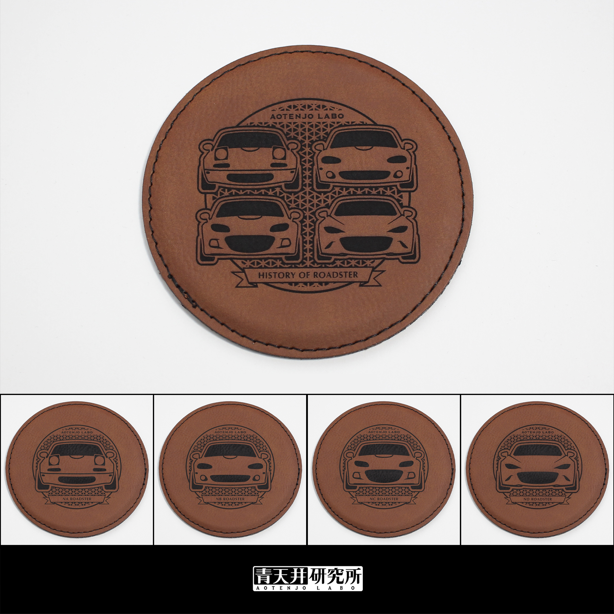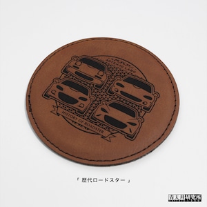 歴代ロードスターの表情を再現したイラストを、シンセティックレザー(合成皮革)にレーザー彫刻を施したコースターです。